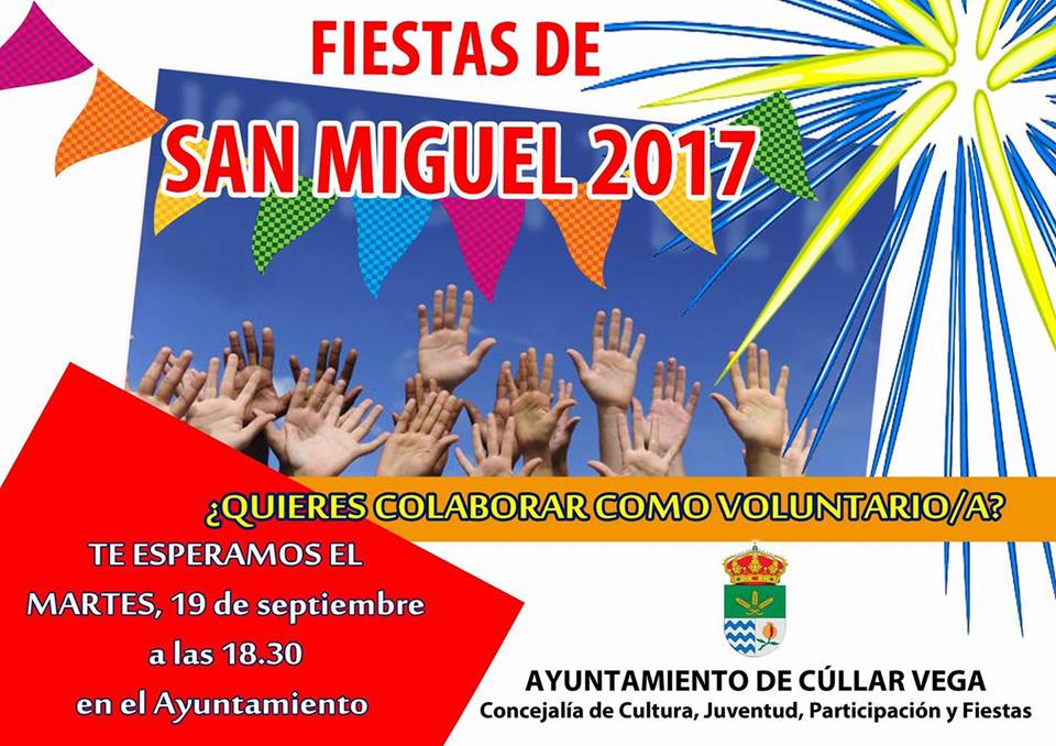 Si estas interesad@ en participar en las próximas Fiestas de Cúllar Vega «San Miguel 2017» y colaborar en la organización y desarrollo de las diferentes actividades que se realizarán esos días, no dudes en venir a la próxima reunión que ha convocado la Concejalía de Fiestas. La cita será el Próximo Martes 19 de Septiembre en el Ayuntamiento de Cúllar