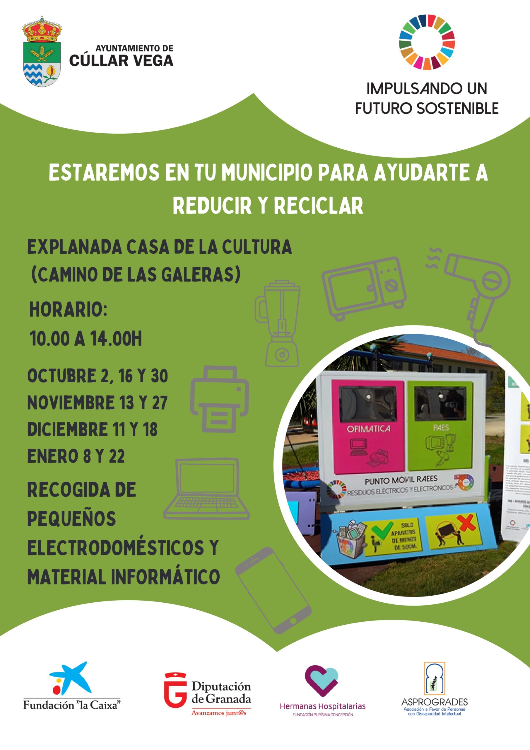 En la Explanada de la Casa de la Cultura (Camino de las Galeras) habrá un punto limpio móvil para recoger pequeños electrodomésticos y material informático los siguientes días en horario de 10 a 14 h.: – 2, 16 y 30 de octubre de 2024 – 13 y 27 de noviembre de 2024 – 11 y 18 de diciembre de 2024
