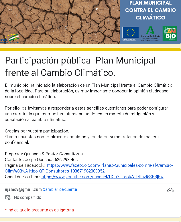 Cúllar Vega ha iniciado la elaboración de un Plan Municipal frente al Cambio Climático y para su desarrollo es muy importante conocer la OPINIÓN CIUDADANA sobre el cambio climático. Por ello, os invitamos a responder a estas sencillas cuestiones para poder configurar una estrategia que marque las futuras actuaciones en materia de mitigación y adaptación al cambio climático. Gracias por