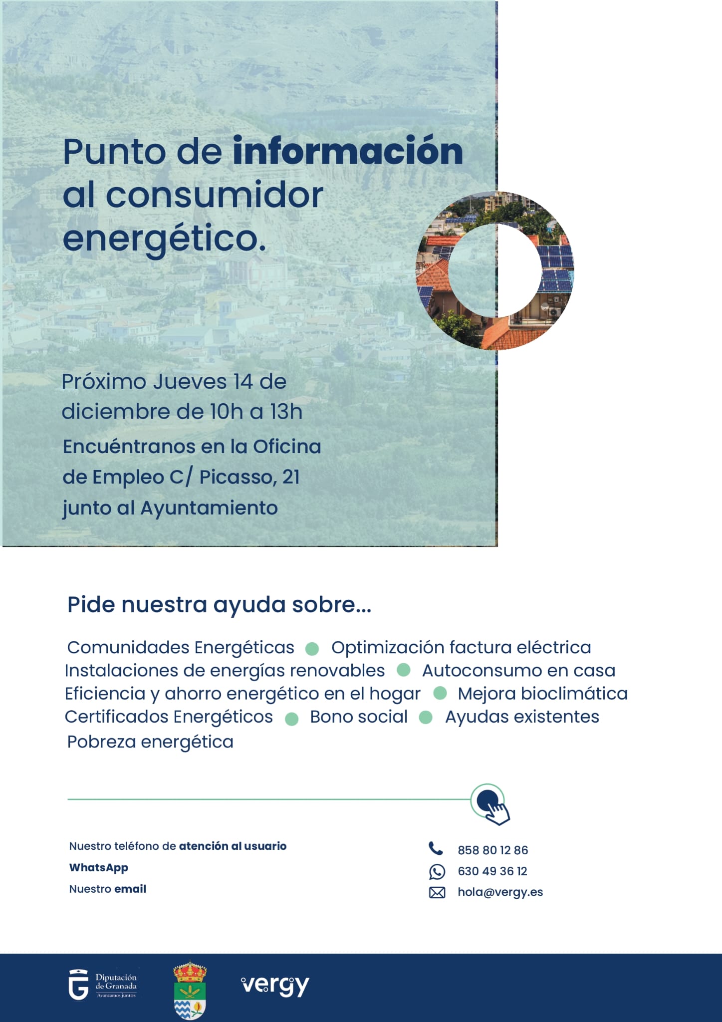 El jueves 14 de diciembre de 10 a 13 h en la Oficina de empleo (C/ Pablo Picasso, 21 (Junto Ayuntamiento), podrás encontrar un punto de información al consumidor energético donde podrás resolver dudas sobre Comunidades energéticas, optimización factura eléctrica, instalaciones de energías renovables, autoconsumo en casa, eficiencia y ahorro energético en el hogar, mejora bioclimática, certificados Energéticos, bono social,