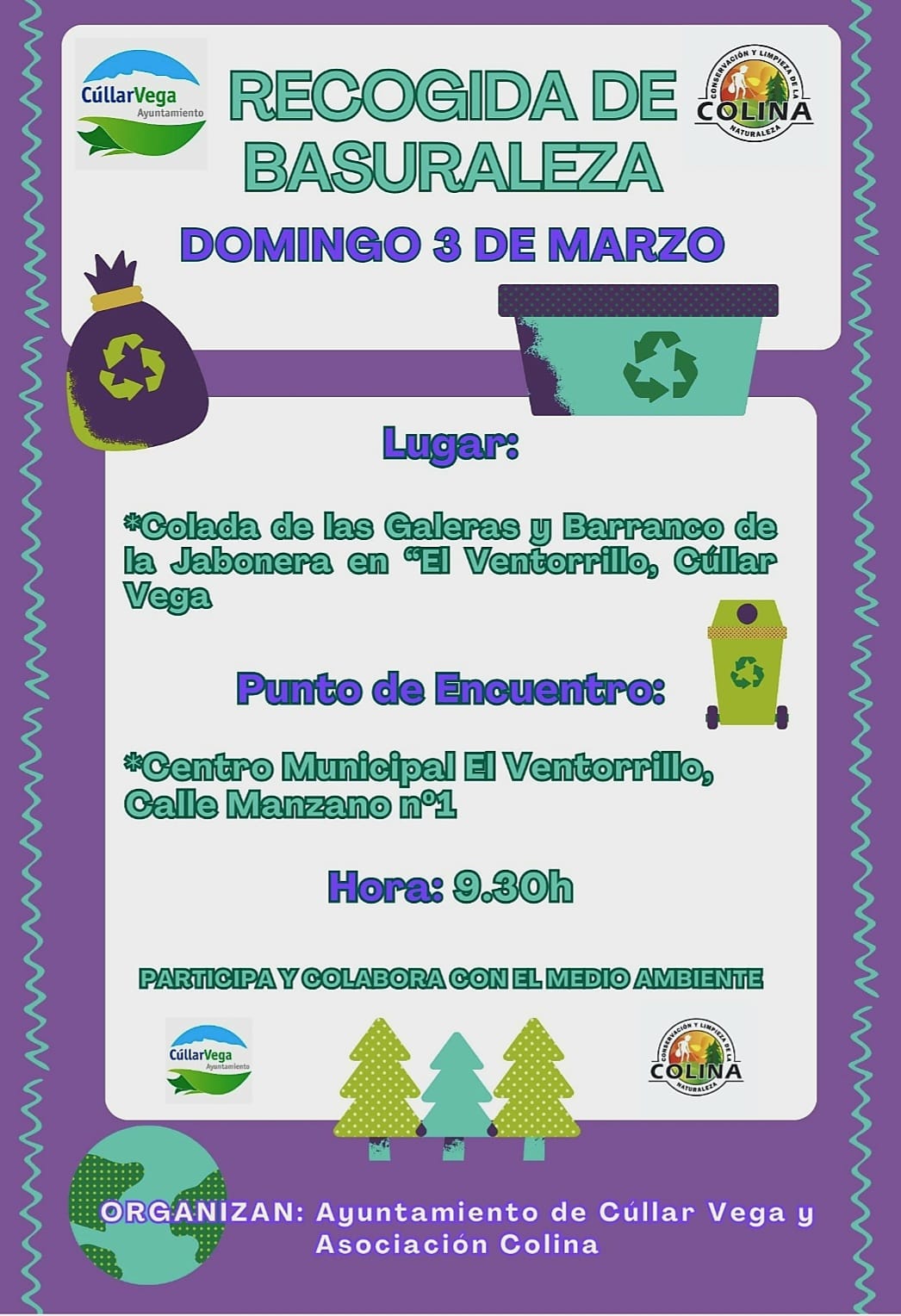 El Ayuntamiento de Cúllar Vega y Asociación Colina, organizan una jornada de recogida de Basuraleza el domingo 3 de marzo a las 09:30 h en la Colada de las Galeras y Barranco La Jabonera en El Ventorrillo. Punto de encuentro: Centro Municipal El Ventorrillo (C/ Manzano 1) Hora: 09:30 h Día: domingo 3 de marzo de 2024 !Participa y colabora