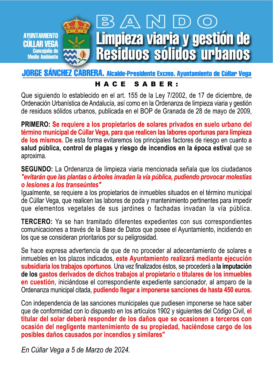 Que siguiendo lo establecido en el art. 155 de la Ley 7/2002, de 17 de diciembre, de Ordenación Urbanística de Andalucía, así como en la Ordenanza de limpieza viaria y gestión de residuos sólidos urbanos, publicada en el BOP de Granada de 28 de mayo de 2009, PRIMERO: Se requiere a los propietarios de solares privados en suelo urbano del