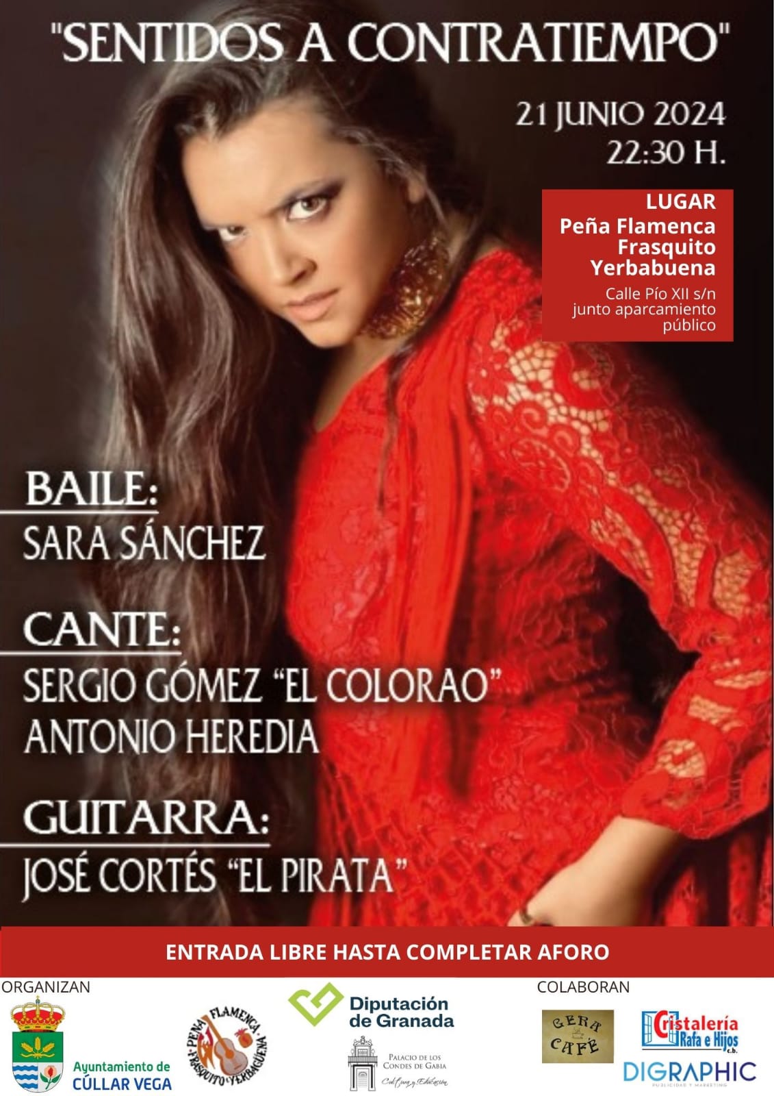 El próximo viernes 21 de junio a las 22:30 h. podréis disfrutar de una nueva actuación en la Peña Flamenca «Frasquito Yerbabuena» con «SENTIDOS A CONTRATIEMPO«, donde actuarán Sara Sánchez al baile, Sergio Gómez «El Colorao» y Antonio Heredia al cante y José Cortés «El Pirata» a la guitarra. Esta actuación forma parte de la programación cultural municipal del Programa
