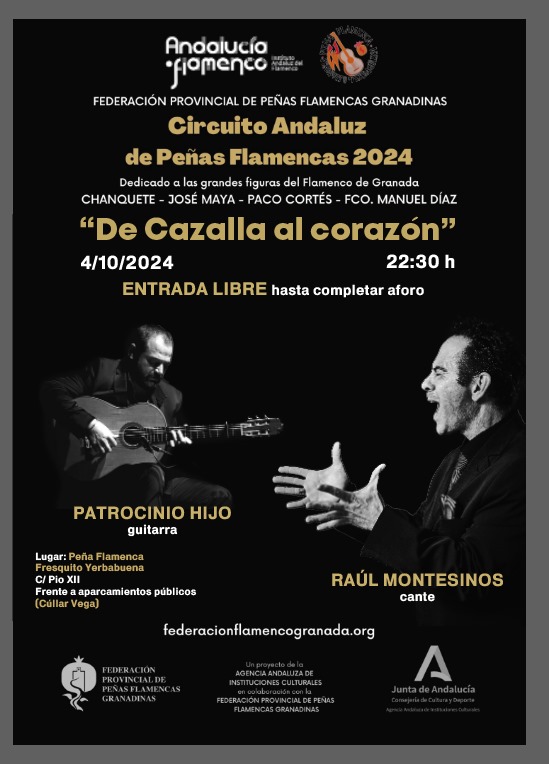 El 4 de octubre de 2023 podremos disfrutar, dentro del circuito Andaluz de Peñas Flamencas 2024, de una cartel de lujo dedicado a las grandes figuras del Flamenco de Granada: al cante Raúl Montesinos y a la guitarra Patrocinio Hijo Lugar: Peña Flamenca Frasquito Yerbabuena C/ Pío XII s/n Cúllar Vega Entrada libre hasta completar aforo Más información: federacionflamencogranada.org