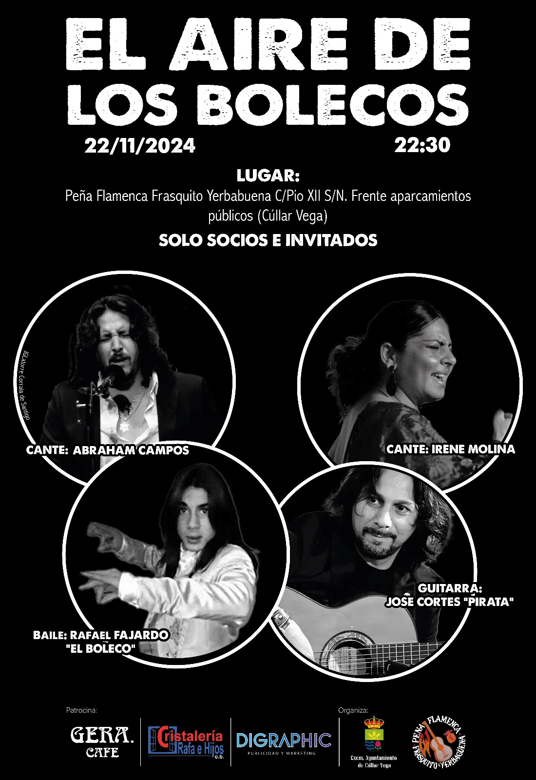 El viernes 22 de noviembre disfruta del mejor cante con Abraham Campos e Irene Molina acompañados al baile por Rafael Fajardo «El Boleco» y José Cortés «Pirata» a la guitarra. – Día: viernes 22 de noviembre de 2024 – Hora: 22:30 h. – Lugar: Peña Flamenca Frasquito Yerbabuena (C/ Pío XII S/n frente aparcamientos públicos – Cúllar Vega) Entrada solo