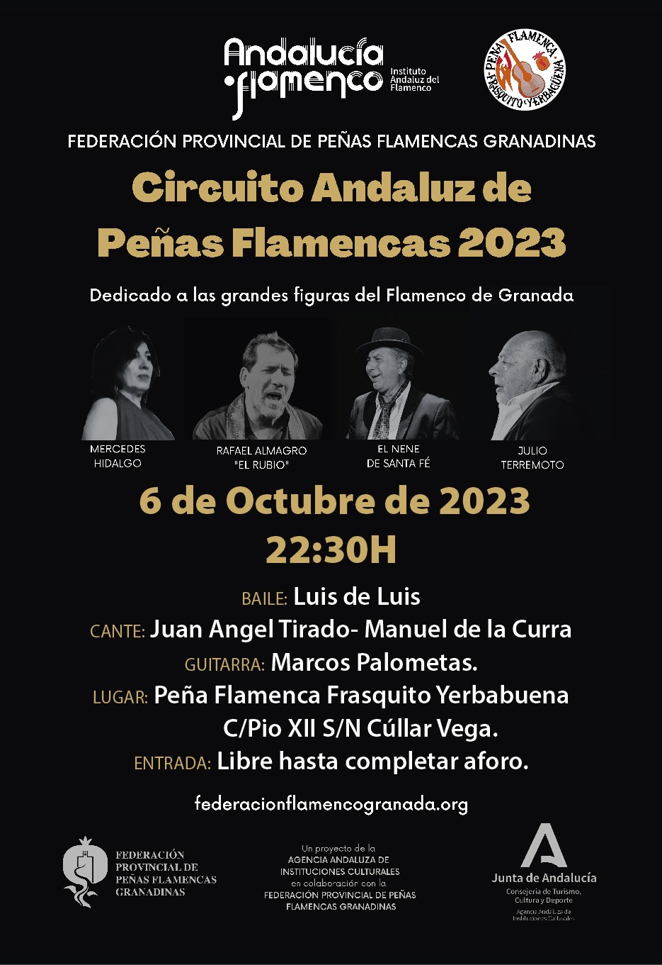 El 6 de octubre de 2023 podremos disfrutar, dentro del circuito Andaluz de Peñas Flamencas 2023, de una cartel de lujo dedicado a las grandes figuras del Flamenco de Granada: al baile Luis de Luis, al cante Juan Ángel Tirado y Manuel de la Curra, y a la guitarra: Marcos Palometas Lugar: Peña Flamenca Frasquito Yerbabuena C/ Pío XII s/n