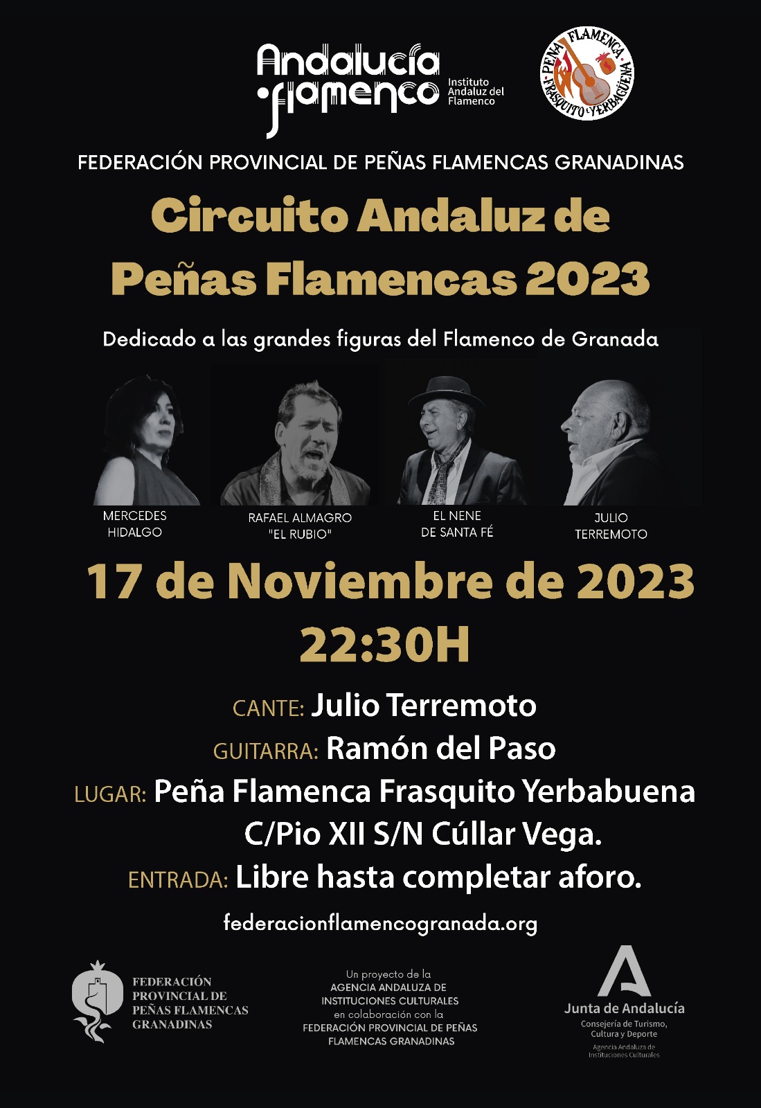 El 17 de noviembre de 2023, a las 22:30 h, podremos disfrutar, dentro del Circuito Andaluz de Peñas Flamencas 2023, de una nueva actuación dedicada a las grandes figuras del Flamenco de Granada: al cante Julio Terremoto y a la guitarra Ramón del Paso. Lugar: Peña Flamenca Frasquito Yerbabuena C/ Pío XII s/n Cúllar Vega. Entrada libre hasta completar aforo