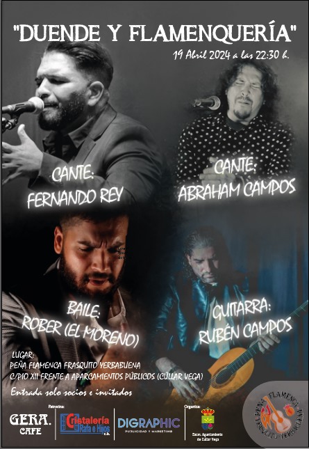 «Duende y Flamenquería», nuevo espectáculo de la Peña Flamenca Frasquito Yerbabuena el viernes 19 de abril con Fernando Rey y Abraham Campos al cante, Rober (El Moreno) al baile y Rubén Campos a la guitarra. Día: viernes 19 de abril de 2024 Hora: 22:30 h. Lugar: Peña Flamenca «Frasquito Yerbabuena» de Cúllar Vega (C/ Pío XII)