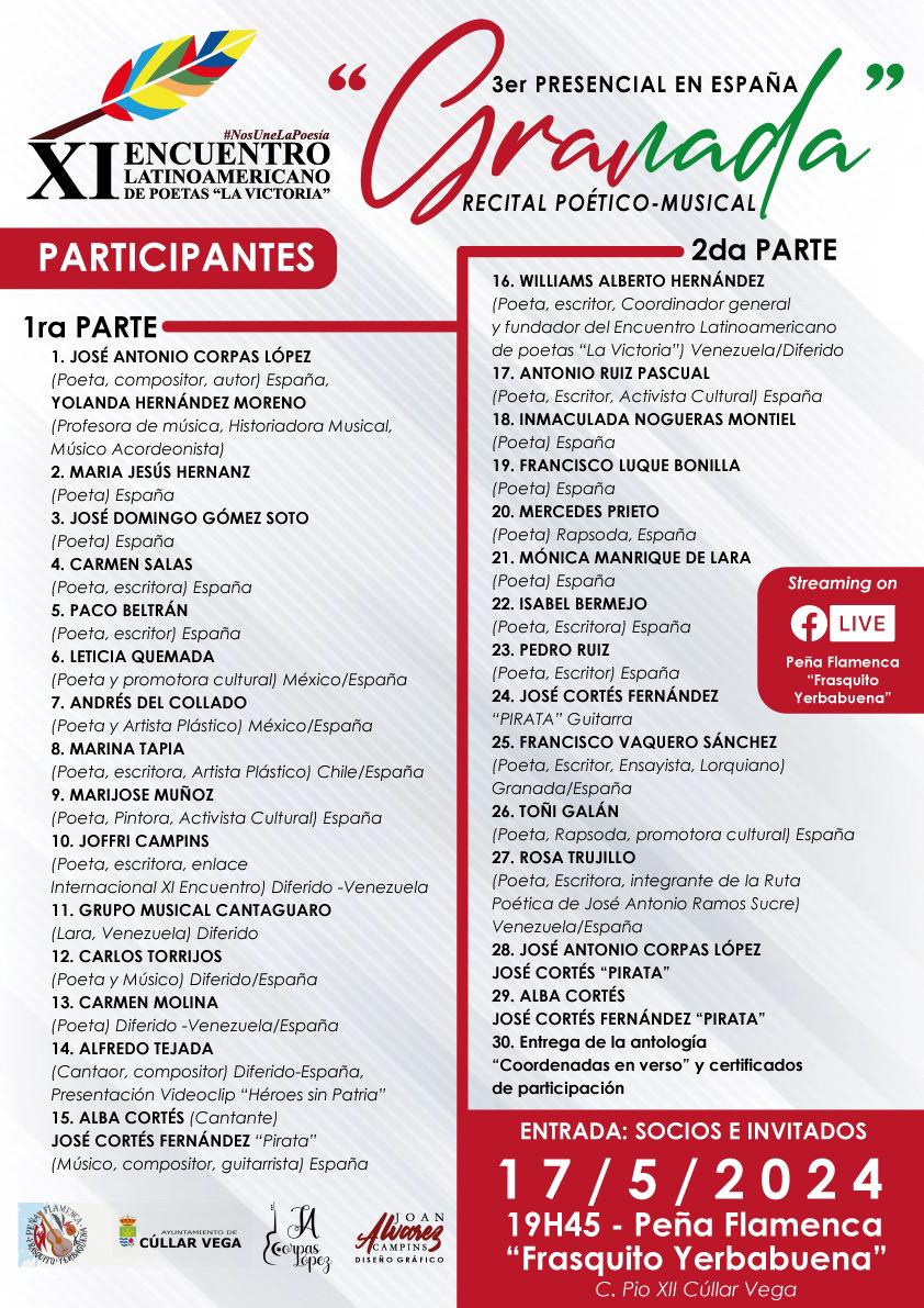 Vive una noche de poetas, cantautores, cantaores y guitarristas en el Undécimo Encuentro Latinoamericano de Poetas «LA VICTORIA» (Tercer Encuentro Presencial en España). Tendrá lugar el viernes 17 de mayo de 2024 a las 19:45 h. en la Peña Flamenca «Frasquito Yerbabuena» en C/ Pio XII Cúllar Vega ————- PRIMERA PARTE 1.- JOSÉ ANTONIO CORPAS LÓPEZ (Poeta, Compositor y Autor)