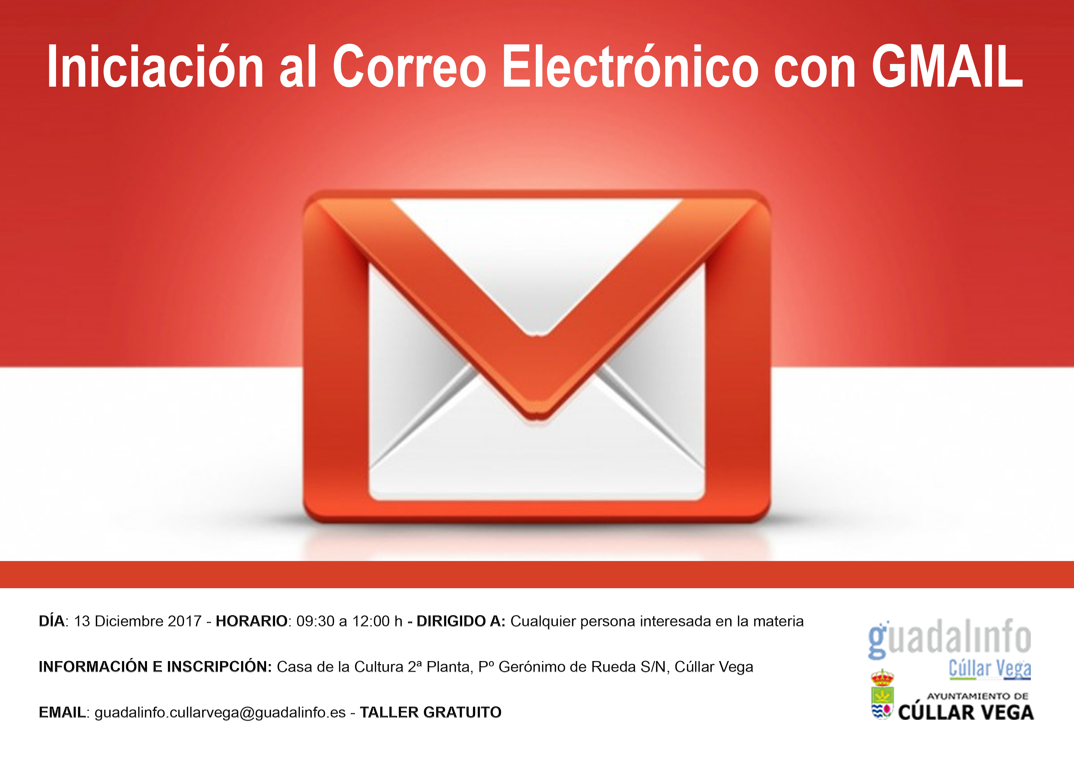 El próximo miércoles 13 de Diciembre se realizará un interesante Taller Gratuito de INICIACIÓN AL CORREO ELECTRÓNICO CON GMAIL en el Centro Guadalinfo de Cúllar Vega de 09:30 a 12:00 h. En el taller aprenderemos a crear una nueva cuenta de Gmail, enviar correos electrónicos, gestionar contactos, crear firmas, etc….