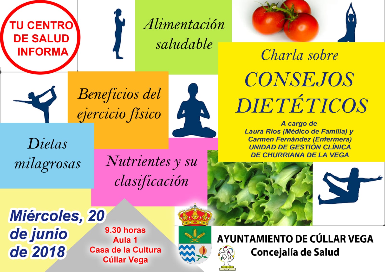 Charla sobre consejos dietéticos a cargo de : Laura Ríos ( Médico de Familia) y Carmen Fernández (Enfermera) Miércoles 20 de junio a las 9:30 Aula 1 Casa de la Cultura