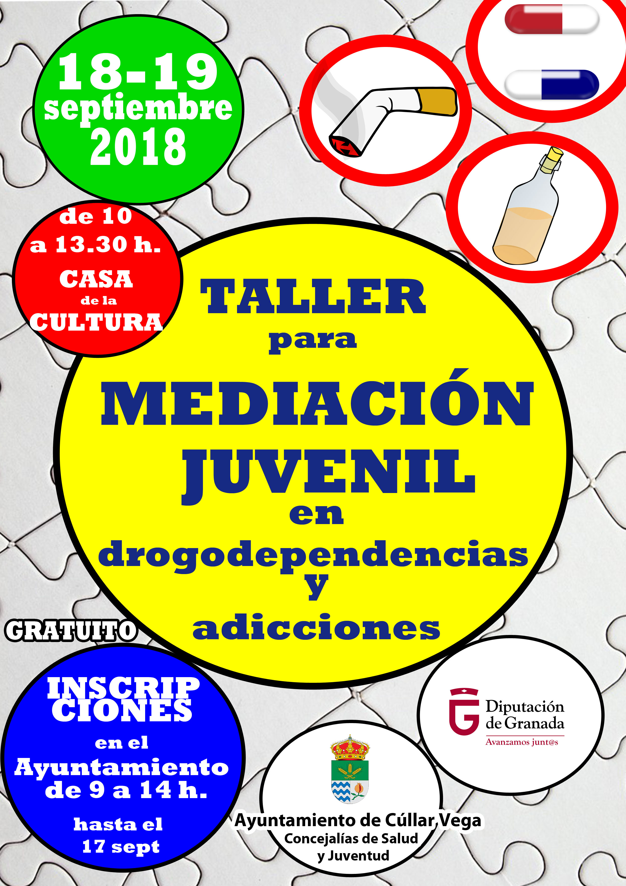 Inscríbete ya en este interesante Taller para la Mediación Juvenil en Drogodependencias y Adicciones. Los objetivos de este taller son: Formar en prevención de las drogodependencias en el municipio a todos aquellos que, de forma profesional o voluntaria trabajen con jóvenes. • Dotar a estos profesionales o voluntarios, de estrategias y habilidades para que sean capaces de transmitir,