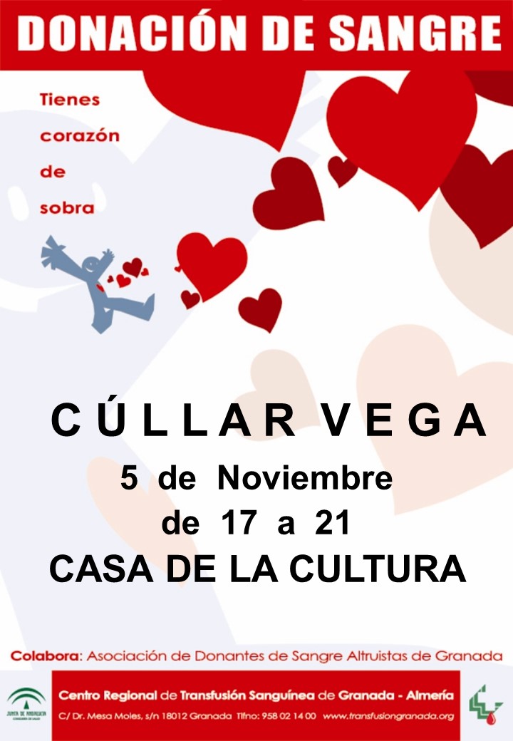 Nueva cita con la Solidaridad en nuestro pueblo será el próximo Martes día 5 de Noviembre de 2019 con una nueva Campaña de Donación de Sangre en Cúllar Vega Tendrá lugar en la Casa de la Cultura Día: Martes día 05 de Noviembre de 2019 Lugar: CASA DE LA CULTURA Horario: de 17 a 21 horas