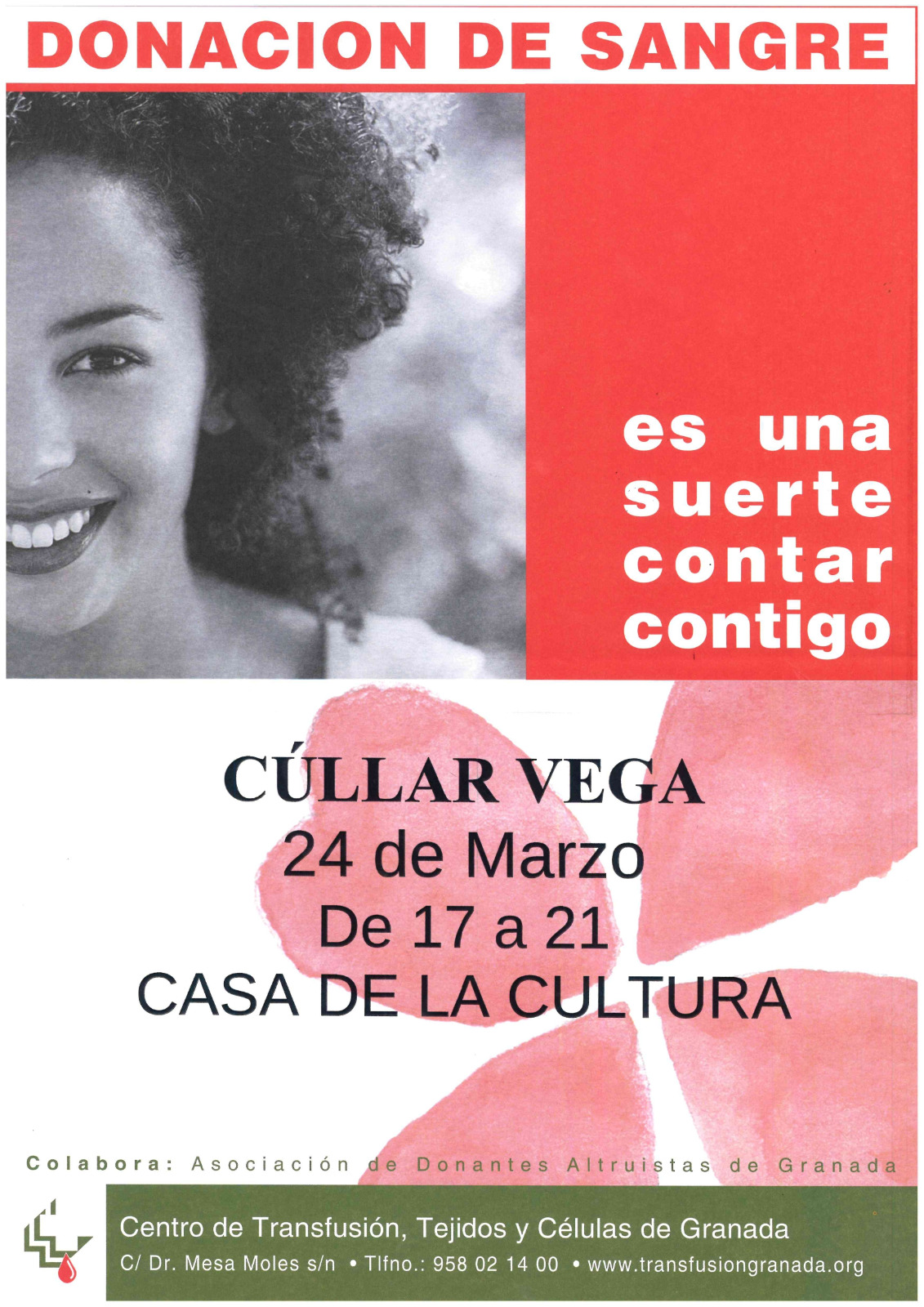 El martes 28 de marzo de 17 a 21 h. DONACIÓN DE SANGRE en la Casa de la Cultura de Cúllar Vega. No faltes a esta cita con la solidaridad.