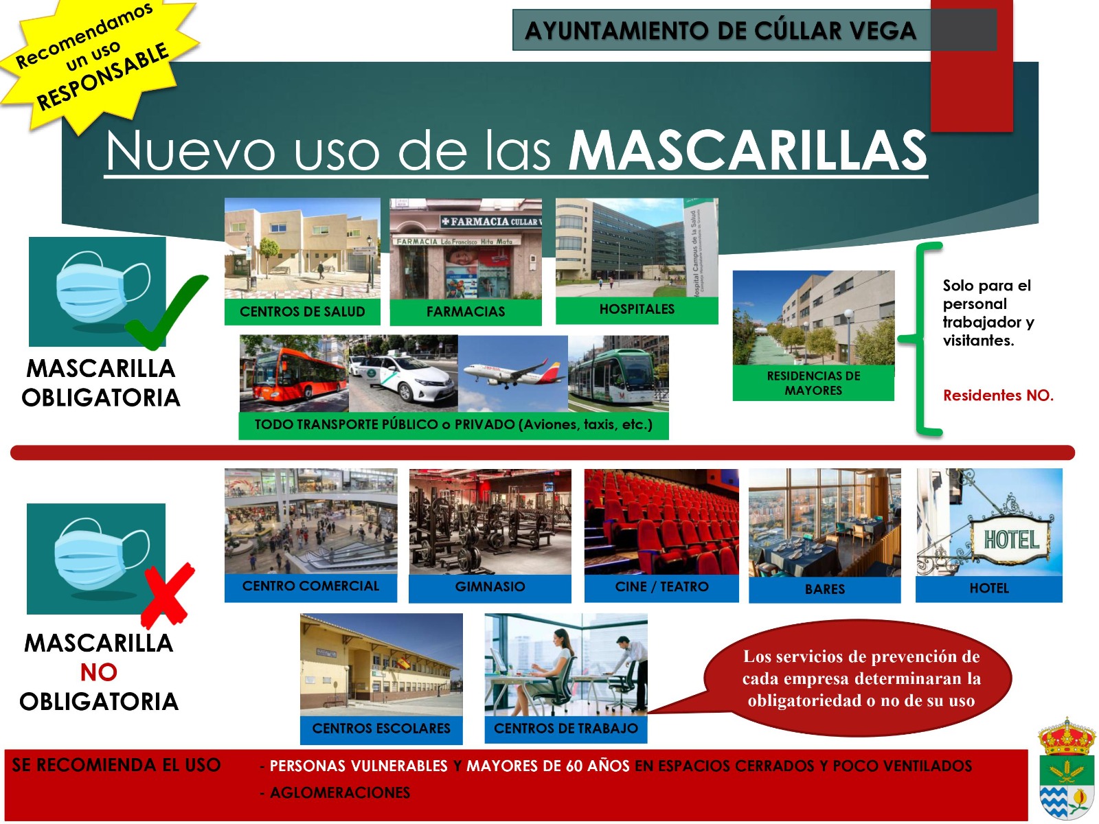 MASCARILLA OBLIGATORIAS: – Centros de Salud – Farmacias – Hospitales – Todo transporte público o privado (aviones, taxis, etc..) – Residencias de Mayores (solo para el personal trabajador y visitantes – para los residentes no será obligatoria) MASCARILLA NO OBLIGATORIA: – Centros comerciales – Gimnasio – Cine – Teatro – Bares – Restaurantes – Hoteles -Centros Escolares – En los