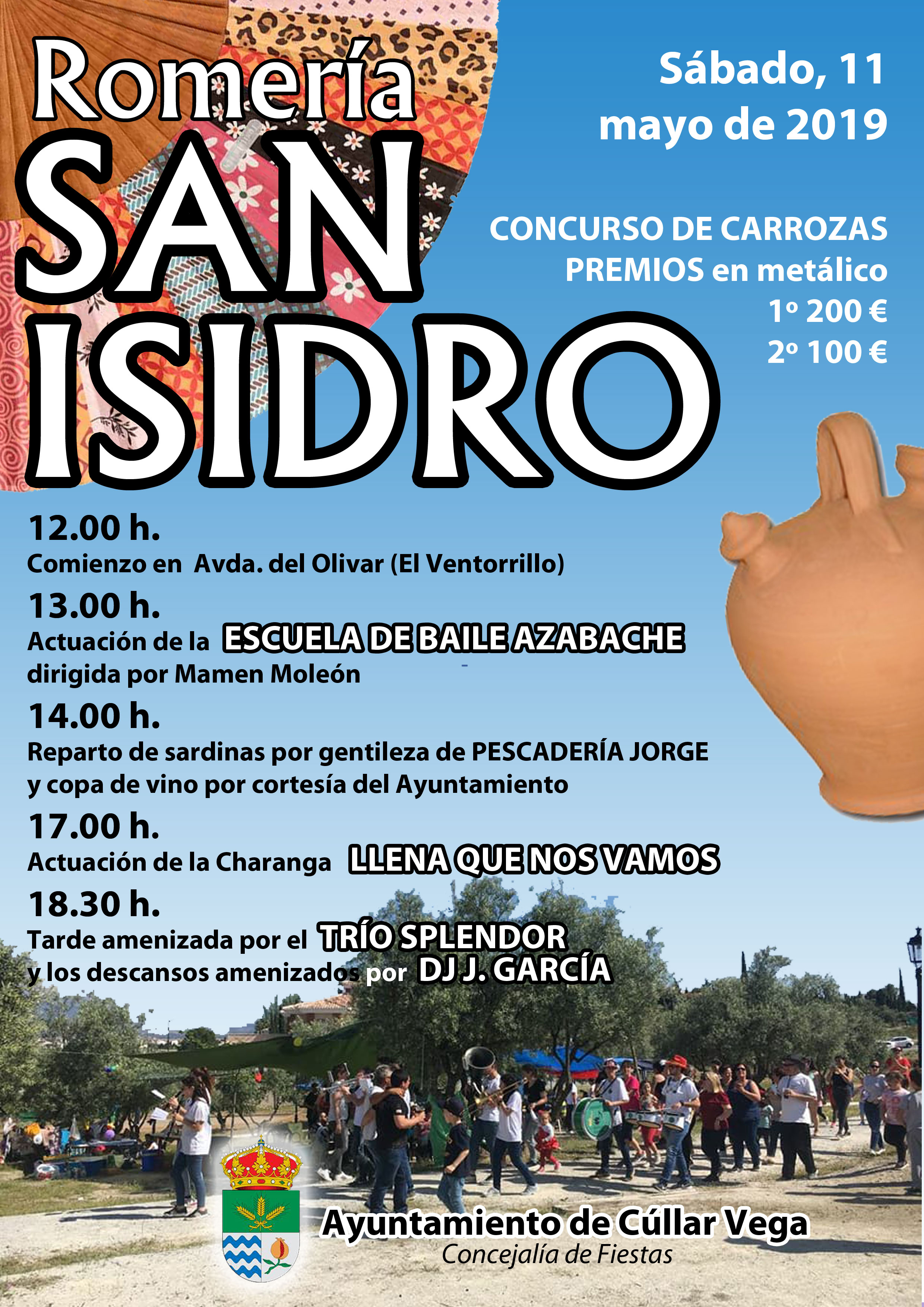El municipio de Cúllar Vega celebrará este sábado, 11 de mayo, su romería más popular, en la que participarán cientos de personas procedentes de toda la Vega. Este tradicional encuentro, que se celebra en honor a San Isidro, patrón de los labradores, tendrá lugar en la Avenida del Olivar (en El Ventorrillo, junto a la residencia Geriatric XXI) y a su vistosidad contribuirán como cada año, las carrozas engalanadas para la ocasión.