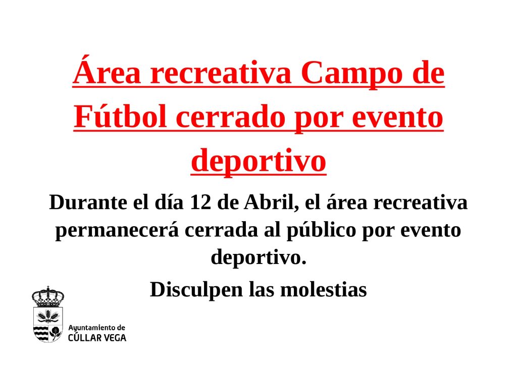 El Ayuntamiento de Cúllar Vega informa de que el próximo 12 de abril el Área Recreativa del Campo de Fútbol permanecerá cerrado al público con motivo de un evento deportivo que se celebrará en sus instalaciones.