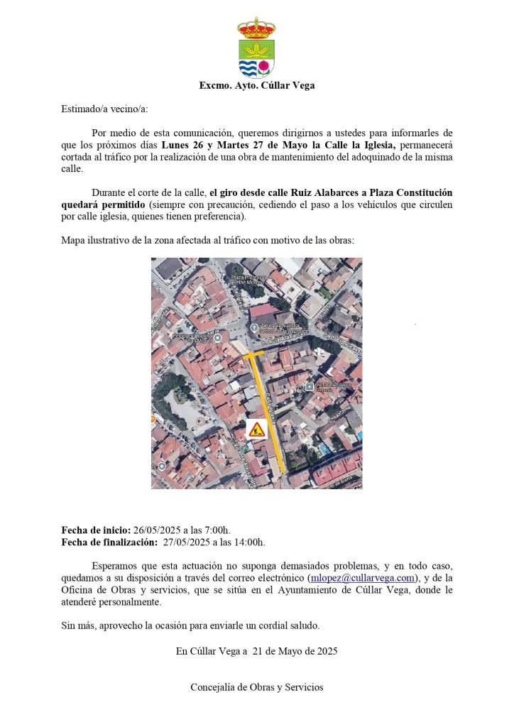En Cúllar Vega a 21 de Mayo de 2025 – Concejalía de Obras y Servicios