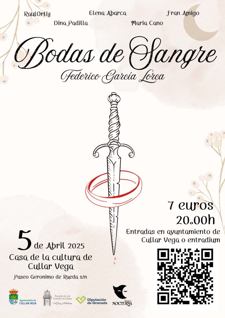El próximo 5 de abril de 2025, la Casa de la Cultura de Cúllar Vega será el escenario de la emblemática obra «Bodas de Sangre» de Federico García Lorca. La función, que dará comienzo a las 20:00 h, y contará con la interpretación de Raúl Ortiz, Elena Abarca, Dina Padilla, María Cano y Fran Amigo.