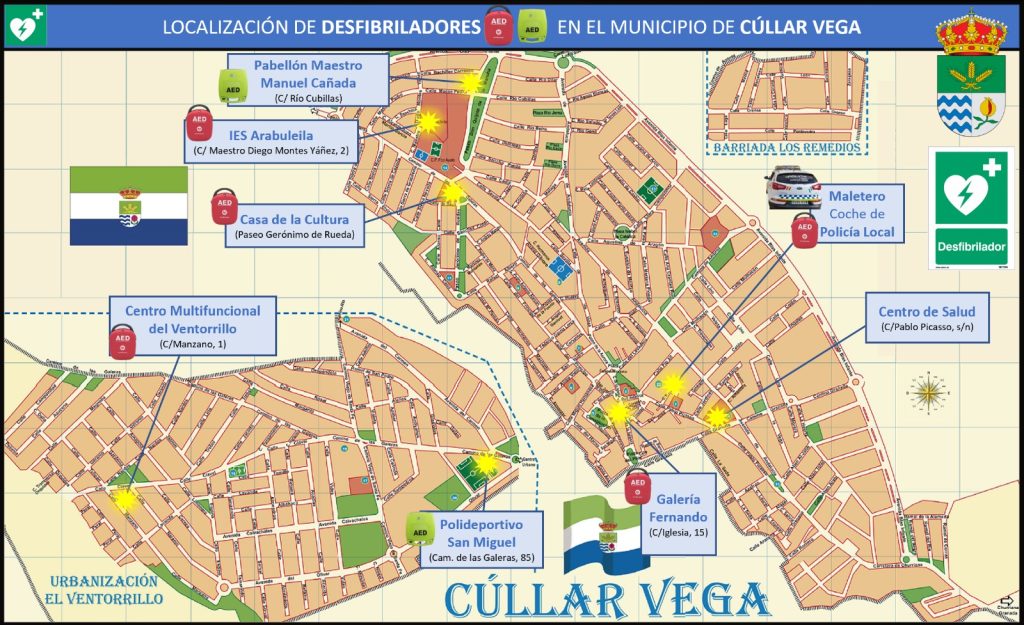 El alcalde de Cúllar Vega, Jorge Sánchez, recuerda que los otros siete desfibriladores que existen en el municipio están ubicados en la Zona Comercial Centro (Galería Fernando); el IES Arabuleila; Casa de la Cultura; Polideportivo San Miguel; Pabellón Maestro Manuel Cañadas, Centro de Salud y en el vehículo de la Policía Local.