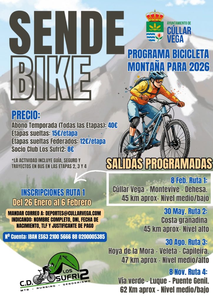 Las inscripciones para la primera ruta estarán abiertas del 26 de enero al 6 de febrero y deberán realizarse enviando un correo electrónico a deportes@cullarvega.com, indicando nombre completo, DNI, fecha de nacimiento, teléfono y justificante de pago. El número de cuenta para realizar el ingreso es IBAN ES63 2100 5666 88 0200005385.