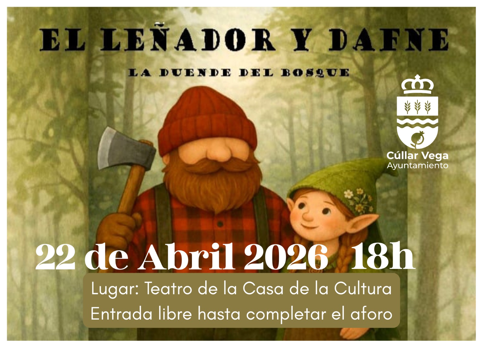 El Ayuntamiento de Cúllar Vega invita a todas las familias del municipio a disfrutar de una tarde mágica de teatro con la representación de la obra «El Leñador y Dafne, la duende del bosque». Una historia entrañable que promete cautivar a los más pequeños y transmitir valores sobre la naturaleza y la amistad.