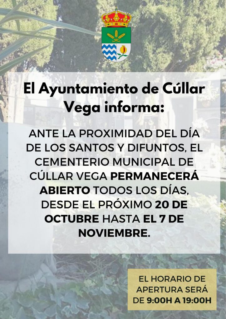 El Ayuntamiento de Cúllar Vega informa que, ante la proximidad del Día de Todos los Santos y Difuntos, el Cementerio Municipal permanecerá abierto todos los días desde el 20 de octubre hasta el 7 de noviembre.