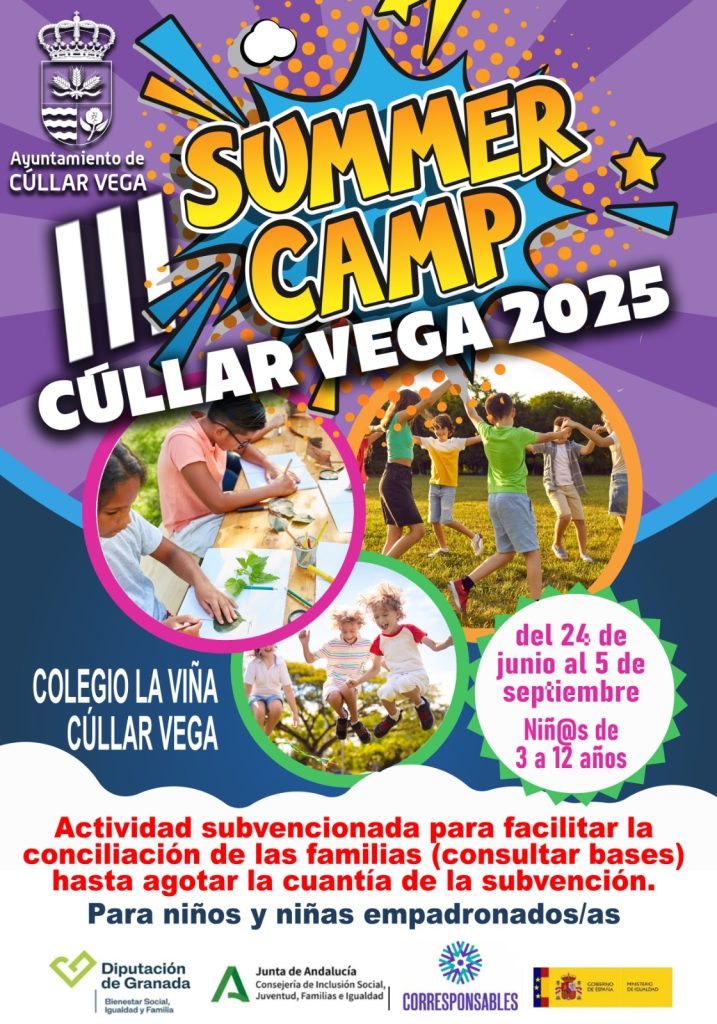 Cúllar Vega abre inscripciones para la tercera edición de su Summer Camp, un campamento de verano dirigido a niños y niñas de 3 a 12 años, que se celebrará del 24 de junio al 5 de septiembre de 2025 en el Colegio La Viña.