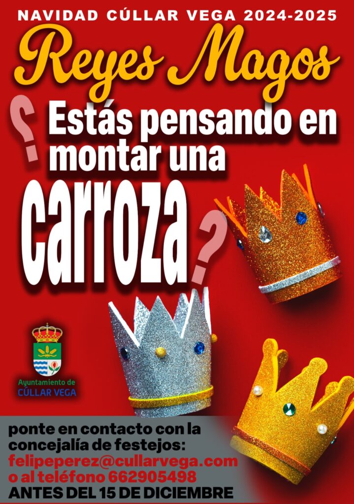 Si estás pensando en montar una carroza para acompañar a sus majestades los Reyes Magos por las calles culleras, ponte en contacto con la Concejalía de Festejos a través del email felipeperez@cullarvega.com o bien al teléfono 662905498 antes del 15 de diciembre.