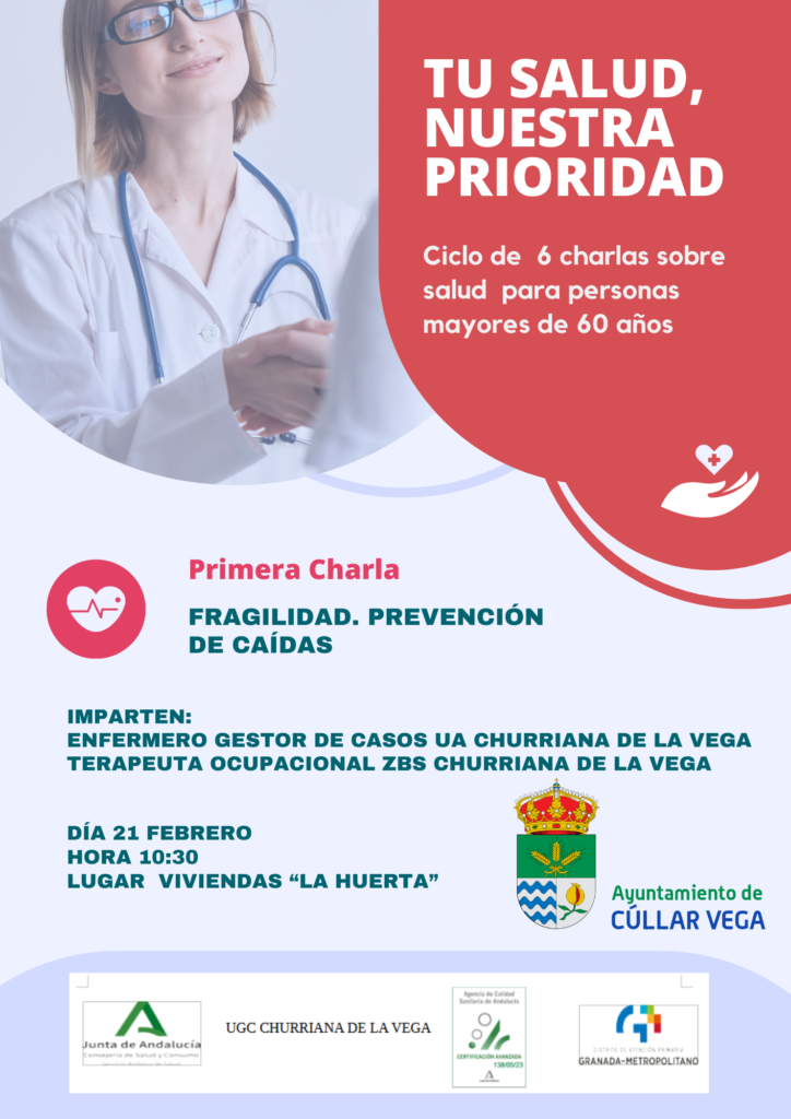 Dentro del ciclo «Tu salud, nuestra prioridad», que consta de 6 charlas sobre salud para personas mayores de 60 años, presentamos la primera de las charlas, FRAGILIDAD, PREVENCIÓN DE CAÍDAS, impartido por el enfermero gestor de casos UA Churriana de la Vega y el terapeuta ocupaciones ZBS de Churriana de la Vega.