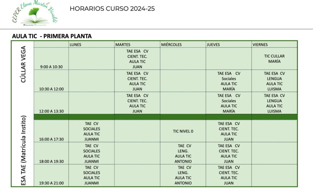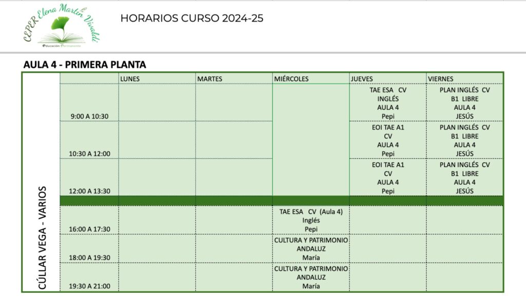 Horario curso 2024-2025 CEPER Elena Martín Vivaldi en Cúllar Vega