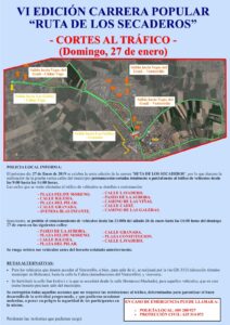 El próximo día 27 de Enero de 2019 se celebra la sexta edición de la carrera ¨RUTA DE LOS SECADEROS¨, por lo que durante la realización de la prueba varias calles del municipio permanecerán cortadas totalmente o parcialmente al tráfico de vehículos desde las 9:00 hasta las 14:00 horas.