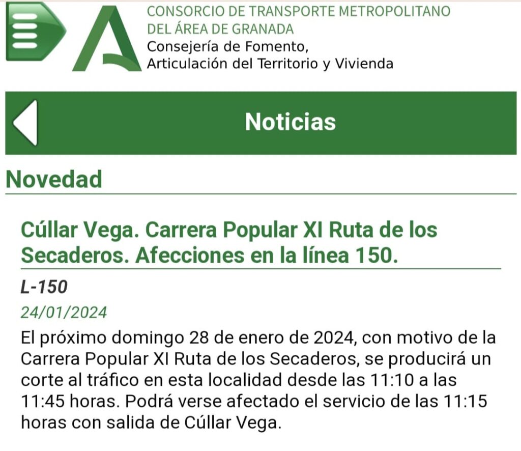 - Se producirá un corte al tráfico que afectará a la línea 150 desde las 11:10 h a las 11:45 h con lo que se podrá verse afectado el servicio de las 11:15 h. con salida desde Cúllar Vega