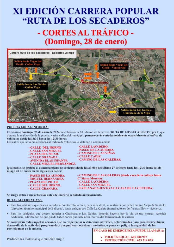 El próximo día 28 de enero de 2024 se celebra la undécima edición de la carrera ¨RUTA DE LOS SECADEROS – DEPORTES OLIMPO¨, por lo que durante la realización de la prueba varias calles del municipio permanecerán cortadas totalmente o parcialmente al tráfico de vehículos desde las 8:30 hasta las 12:30 horas aproximadamente.