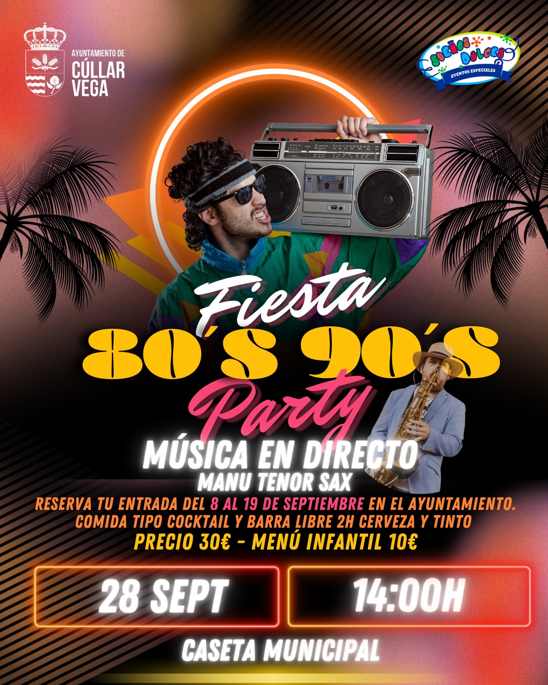 – Descripción: ¡Prepárate para revivir las mejores décadas con música en directo a cargo de Manu Tenor Sax! Disfruta de cócteles y barra libre de cerveza y vino durante 2 horas mientras te sumerges en el ambiente festivo de los años 80 y 90.