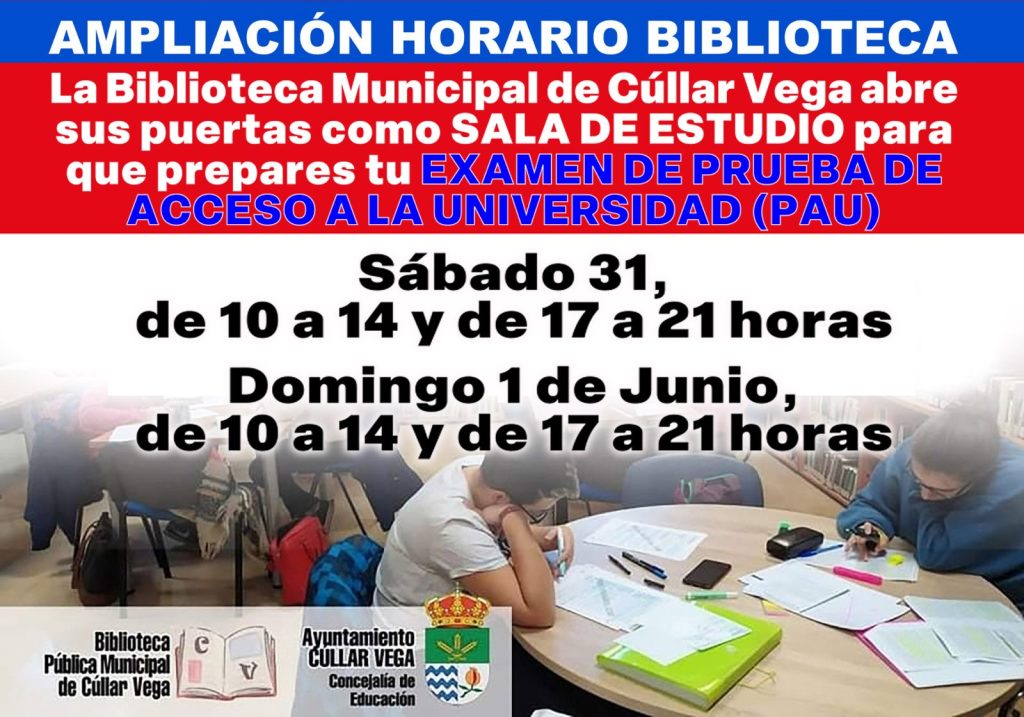 La Concejalía de Educación del Ayuntamiento de Cúllar Vega ha anunciado la ampliación del horario de la Biblioteca Pública Municipal durante el último fin de semana de mayo, con el objetivo de facilitar un espacio adecuado de estudio a los jóvenes del municipio que se preparan para el Examen de Prueba de Acceso a la Universidad (PAU).