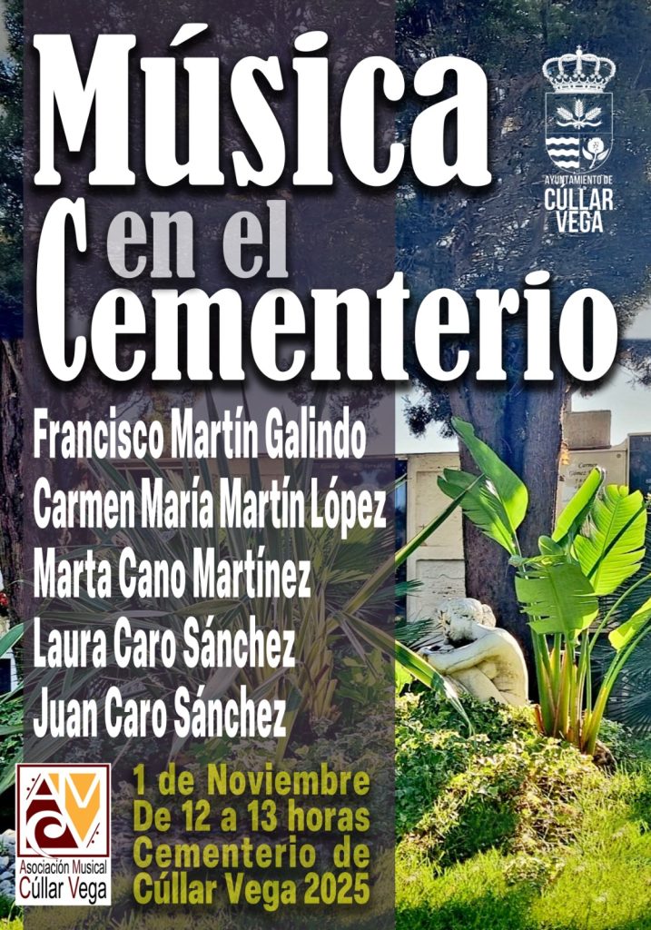 El próximo 1 de noviembre, el Cementerio Municipal de Cúllar Vega volverá a acoger una nueva edición del emotivo concierto “Música en el Cementerio”, organizado por la Asociación Musical de Cúllar Vega con la colaboración del Ayuntamiento.