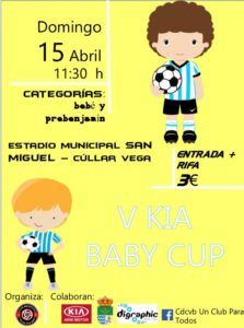 El Estadio Municipal San Miguel de Cúllar Vega acogerá este domingo, 15 de abril, a partir de las 11,30 horas la V Kia Baby Cup, organizada por el Club Deportivo Cúllar Vega Base con la colaboración de la concejalía de Deportes del Ayuntamiento cullero, Kia Motor y Digraphic.