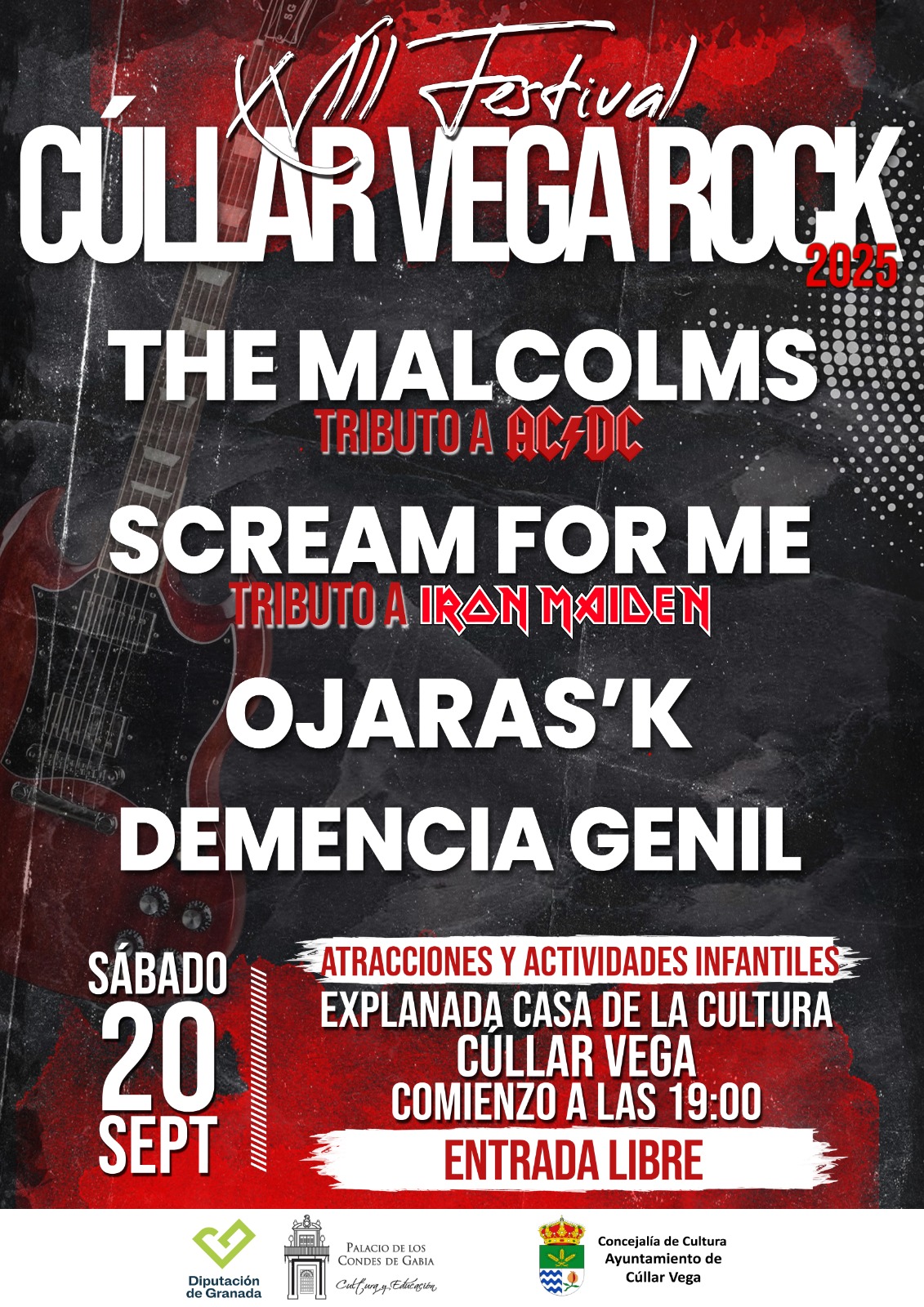 Cúllar Vega volverá a vibrar con la mejor música en directo gracias al XVIII Festival Rock Cúllar Vega 2025, que se celebrará el sábado 20 de septiembre a partir de las 19:00 horas en la Explanada de la Casa de la Cultura. El cartel de esta edición reúne a The Malcolms (Tributo a AC/DC), Scream For Me (Tributo a Iron