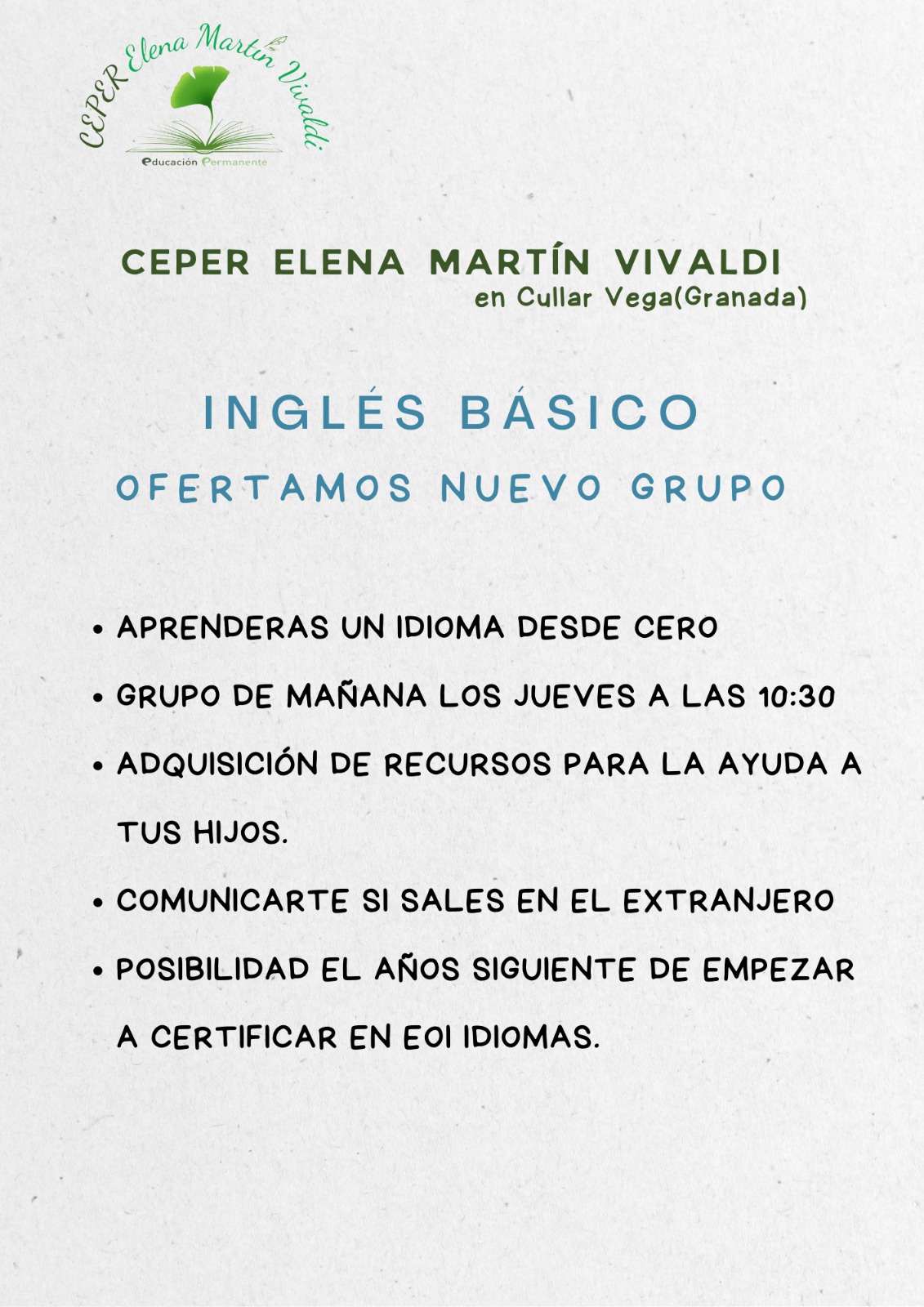 El CEPER Elena Martín Vivaldi en Cúllar Vega abre un nuevo grupo de Inglés Básico, pensado para quienes deseen iniciarse en este idioma desde cero. Las clases se impartirán en horario de mañana, los jueves a las 10:30 horas, ofreciendo un espacio accesible y adaptado para aprender de manera práctica y sencilla. Entre los beneficios del curso se incluyen la