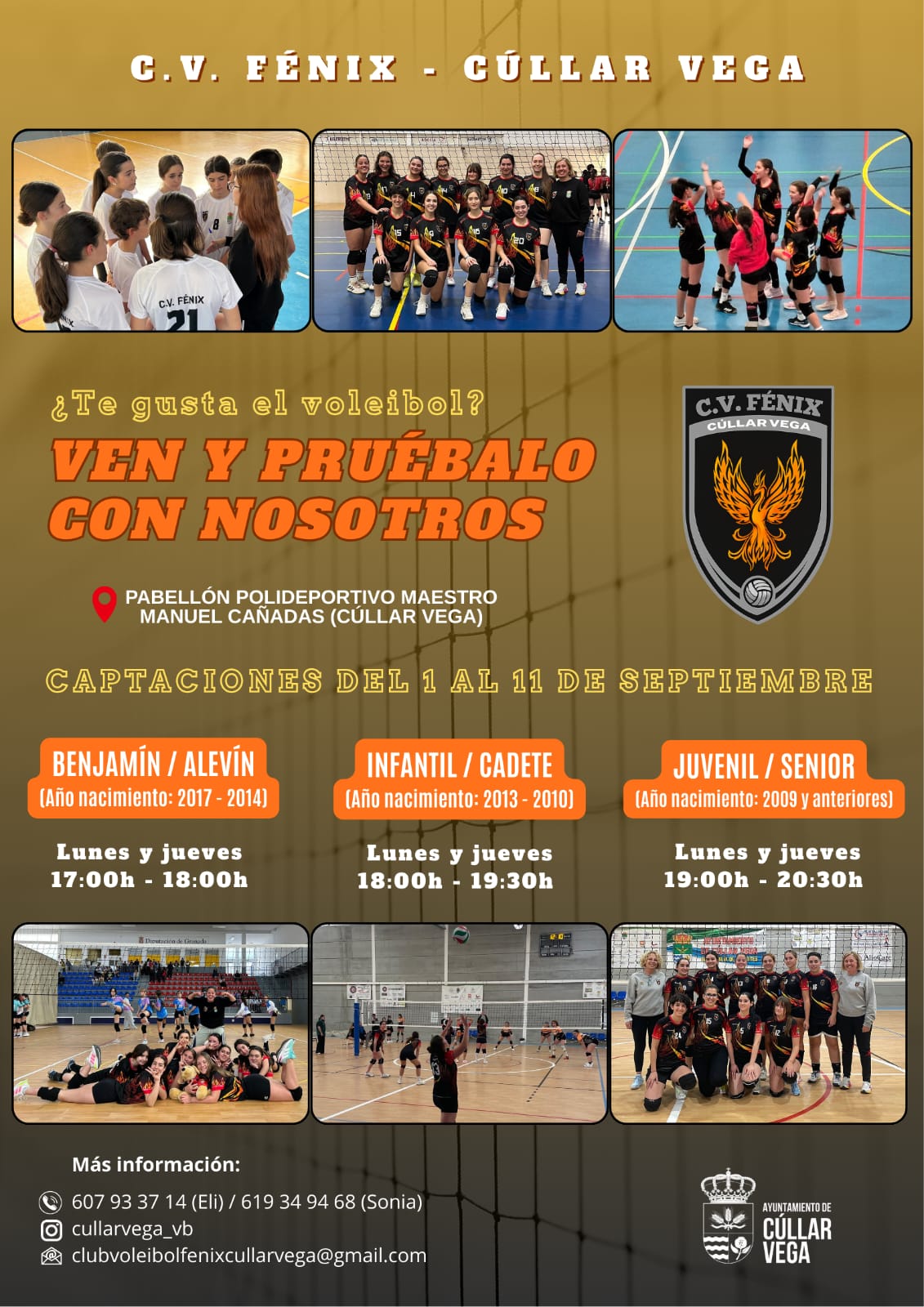 El Club CV Fénix de Voleibol invita a todos los vecinos y vecinas a probar este deporte durante las jornadas de captaciones, que se celebrarán del 1 al 11 de septiembre en el Pabellón Polideportivo Manuel Cañadas de Cúllar Vega. Las categorías están abiertas para diferentes edades y niveles: Las personas interesadas pueden obtener más información en los teléfonos 607