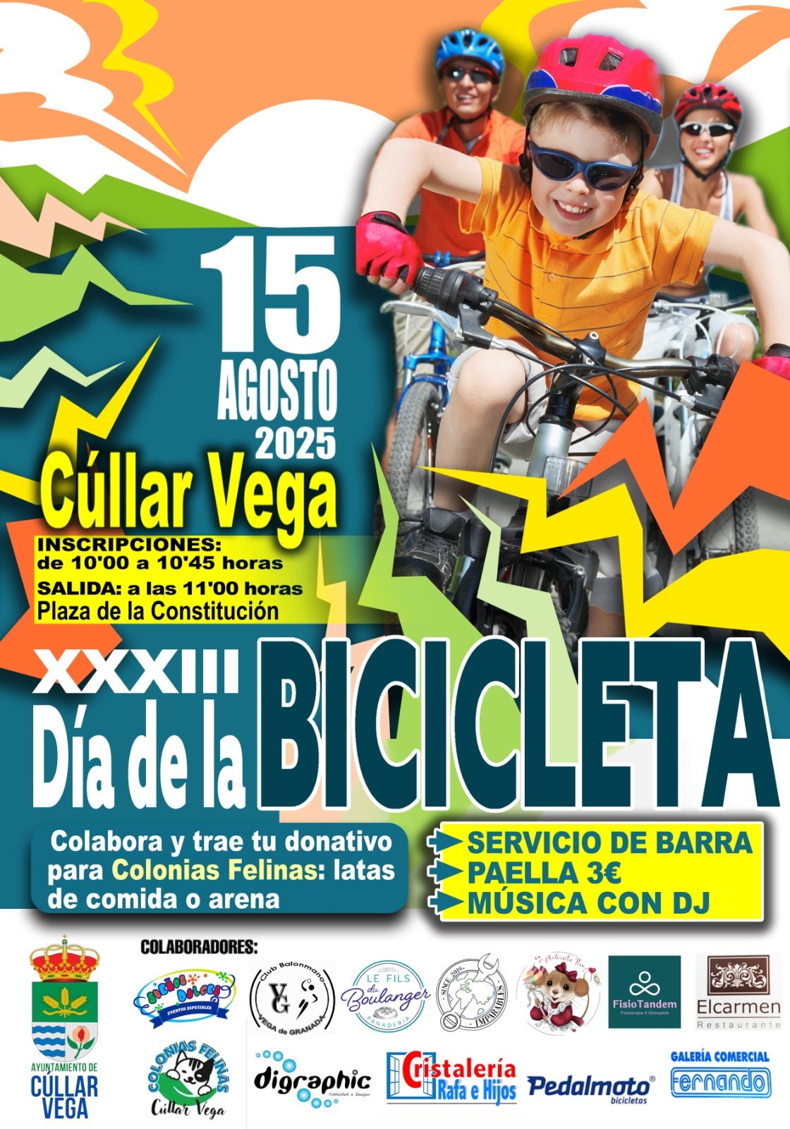 La XXXIII edición de este evento deportivo se celebrará este viernes, 15 de agosto, a partir de las 11horas El Ayuntamiento y los establecimientos colaboradores sortearán bicicletas y material deportivo entre todos los participantes El municipio de Cúllar Vega acogerá este viernes, 15 de agosto, una nueva edición (y ya van 33 consecutivas) de su tradicional ‘Día de la Bicicleta’,