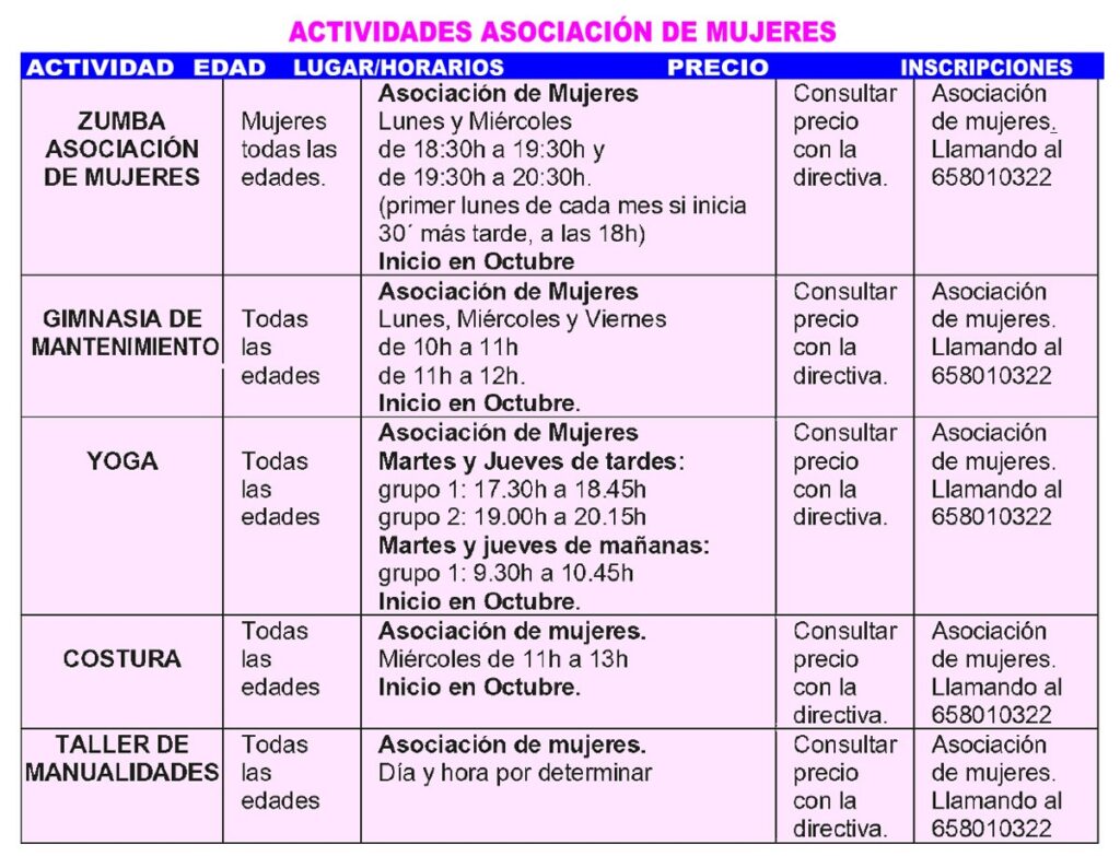 ACTIVIDADES ASOCIACIÓN DE MUJERES: Zumba, Gimnasia de mantenimiento, Yoga, Costura, Manualidades