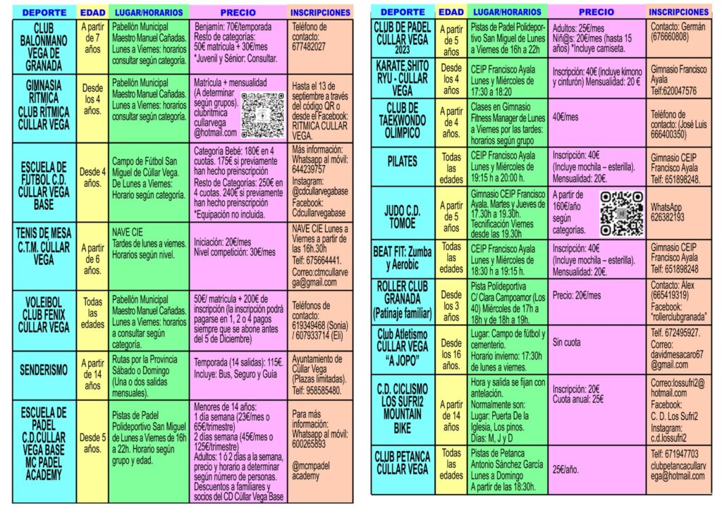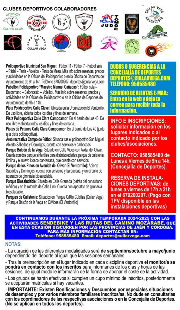 CONTACTO: 958585480 de Lunes a Viernes de 9h a 14h. deportes@cullarvega.com (Concejalía de Deportes).