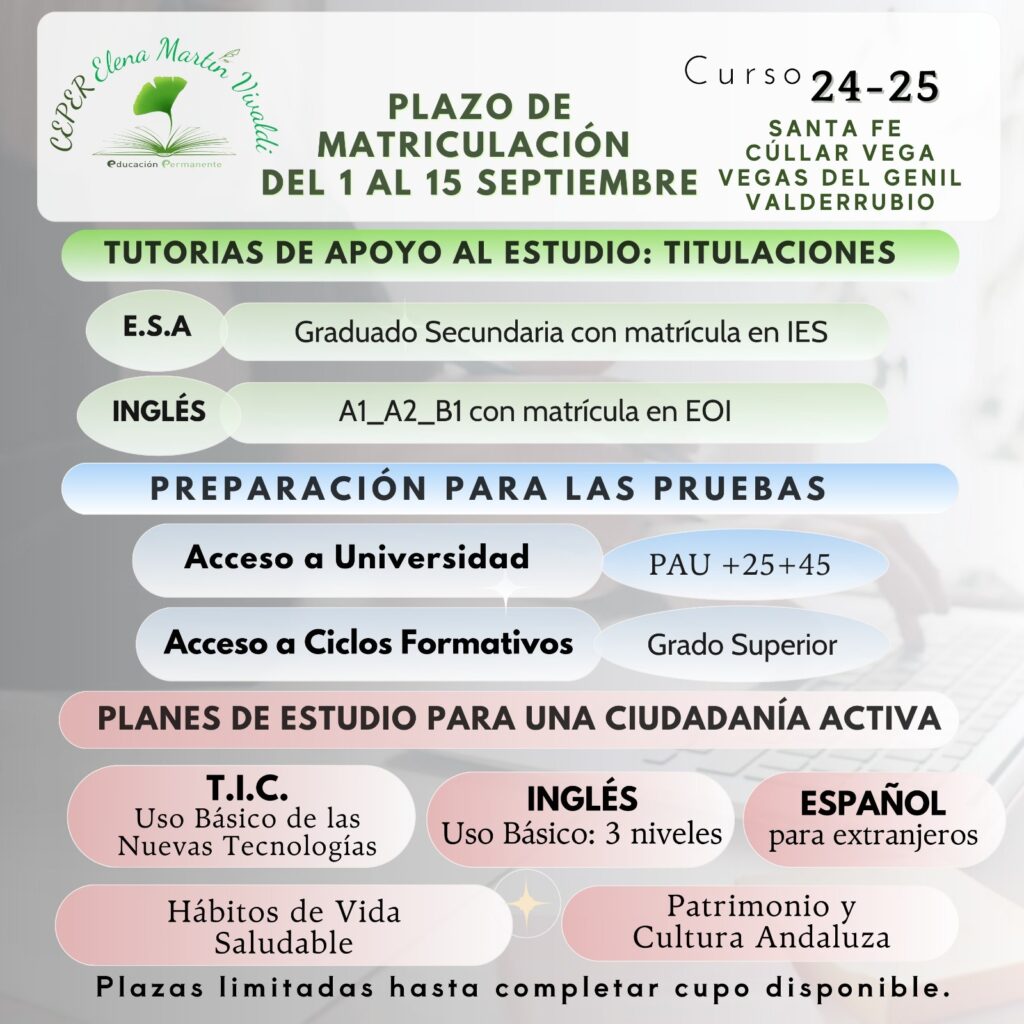 Del 1 al 15 de septiembre se abre un plazo extraordinario para la matriculación en PLAZAS VACANTES en el Centro de Educación Permanente Elena Martín Vivaldi (Escuela de Adultos) para curso 2024-2025