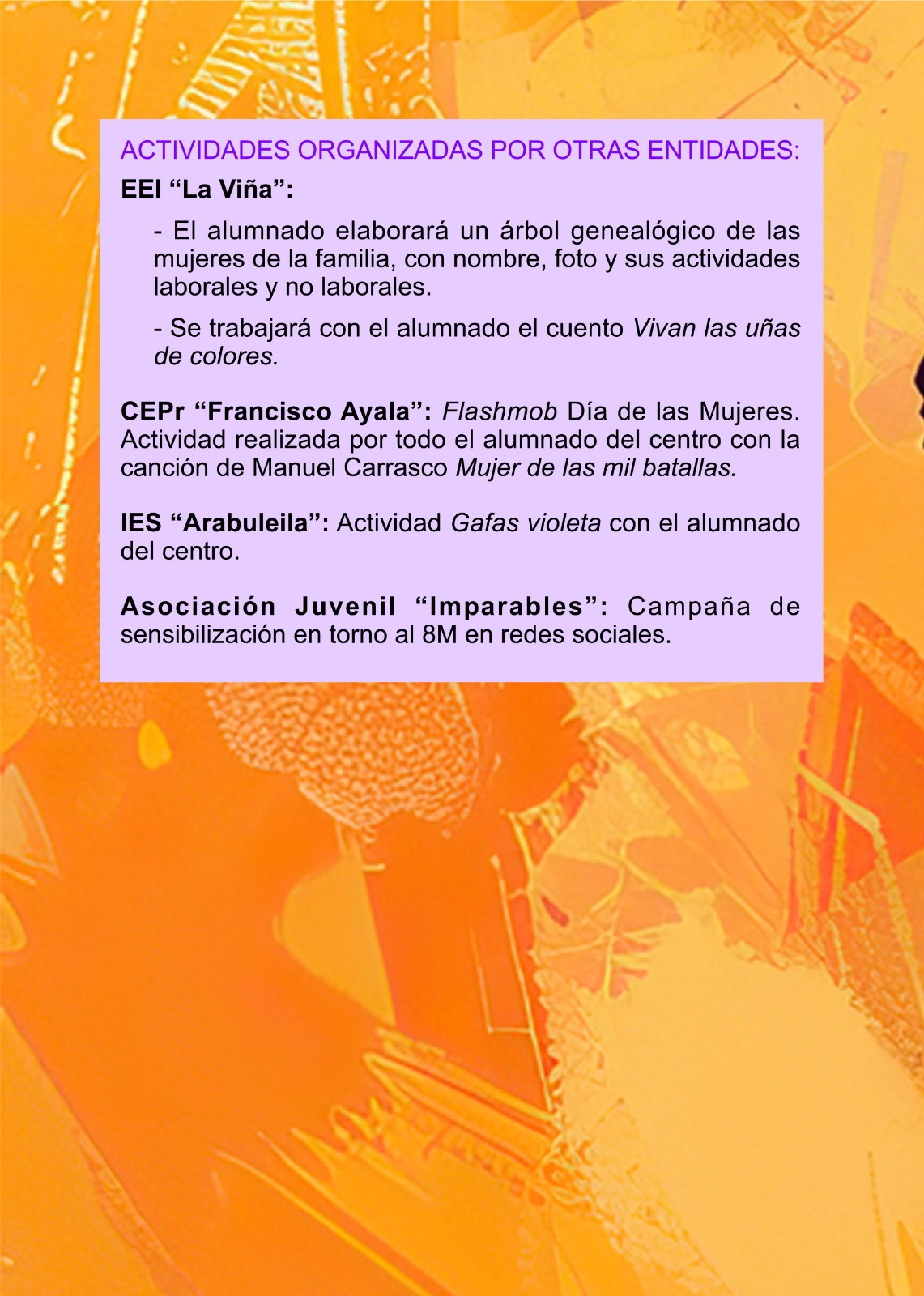 – CEPr “Francisco Ayala”: Flashmob Día de las Mujeres. Actividad realizada por todo el alumnado del centro con la canción de Manuel Carrasco Mujer de las mil batallas.