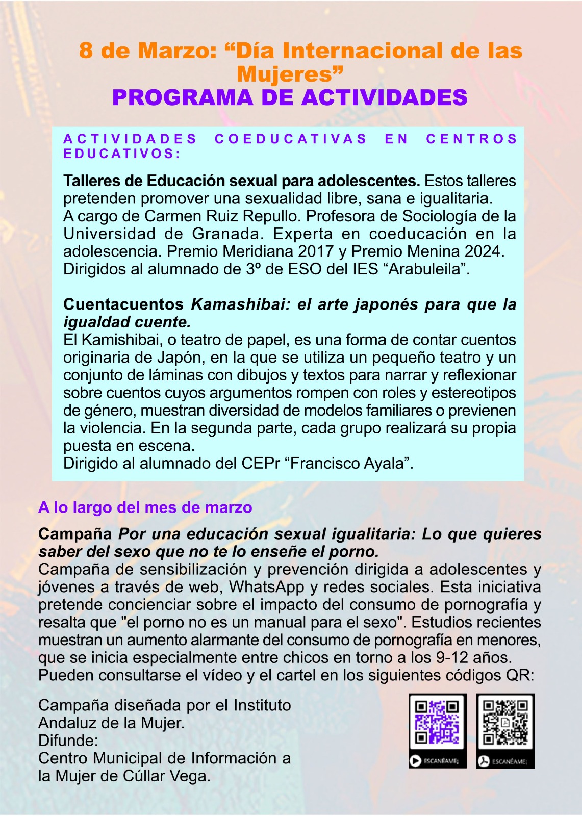 – Campaña – Por una educación sexual igualitaria: Lo que quieres saber del sexo que no te lo enseñe el porno. Campaña de sensibilización y prevención dirigida a adolescentes y jóvenes a través de web, WhatsApp y redes sociales. Esta iniciativa pretende concienciar sobre el impacto del consumo de pornografía y resalta que «el porno no es un manual para el sexo». Estudios recientes muestran un aumento alarmante del consumo de pornografía en menores, que se inicia especialmente entre chicos en torno a los 9-12 años. Campaña diseñada por: el Instituto Andaluz de la Mujer. Difunde: Centro Municipal de Información a la Mujer de Cúllar Vega.