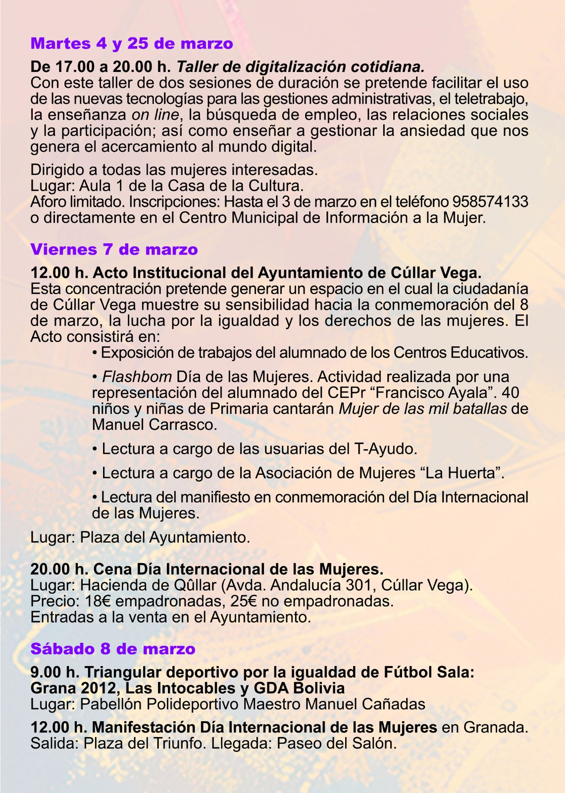 – 20.00 h. Cena Día Internacional de las Mujeres. Lugar: Hacienda de Cúllar (Avda. Andalucía 301, Cúllar Vega). Precio: 18€ empadronadas, 25€ no empadronadas. Entradas a la venta en el Ayuntamiento.