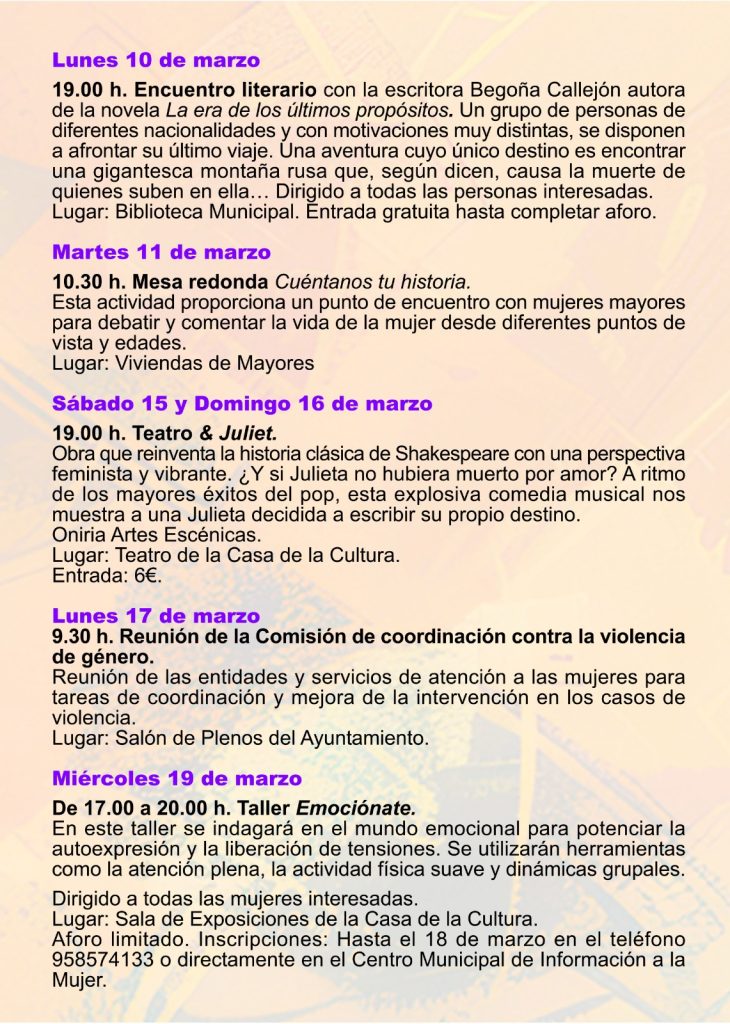 – De 17.00 a 20.00 h. Taller – Emociónate. En este taller se indagará en el mundo emocional para potenciar la autoexpresión y la liberación de tensiones. Se utilizarán herramientas como la atención plena, la actividad física suave y dinámicas grupales. Dirigido a: todas las mujeres interesadas. Lugar: Sala de Exposiciones de la Casa de la Cultura. Aforo limitado. Inscripciones: Hasta el 18 de marzo en el teléfono 958574133 o directamente en el Centro Municipal de Información a la Mujer.
