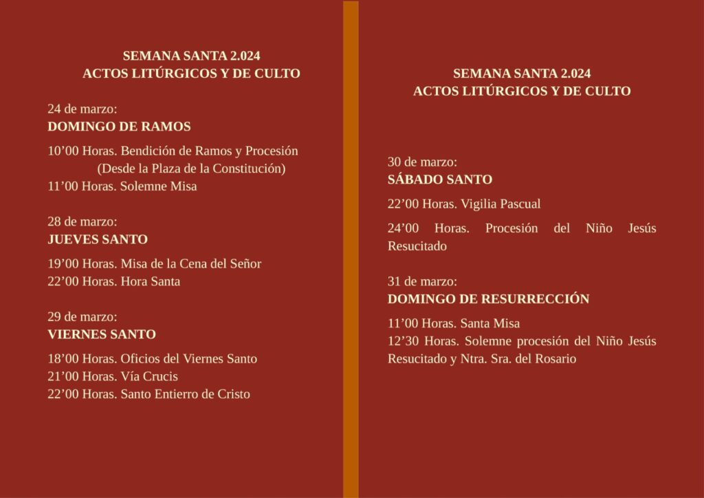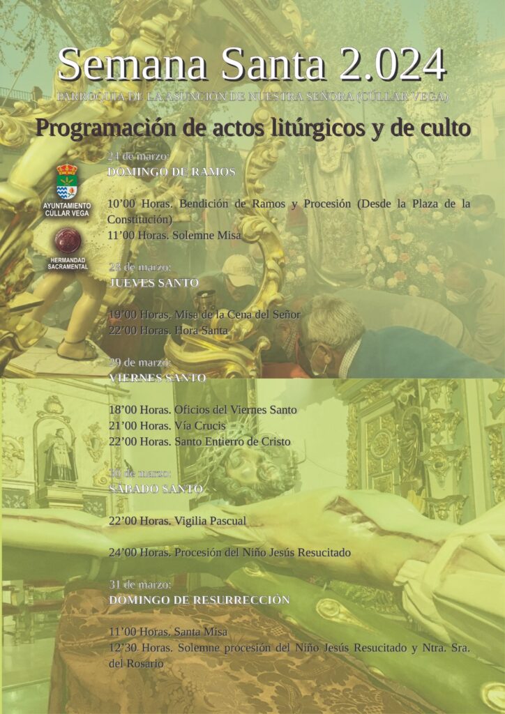 Aquí os dejamos los diferentes horarios de los oficios que tendrán lugar en la Parroquia de Nª Sª de la Asunción de Cúllar Vega para la Semana Santa 2024: